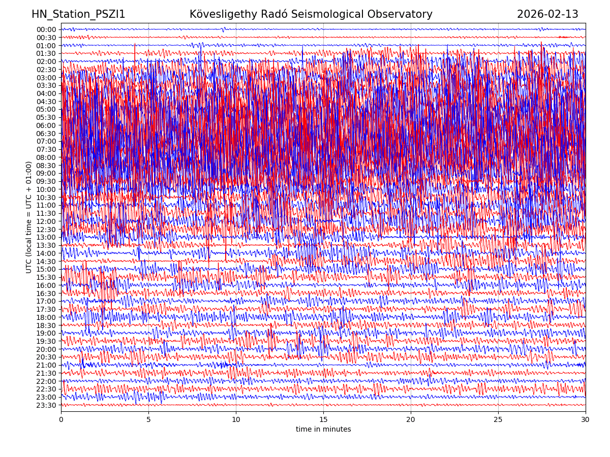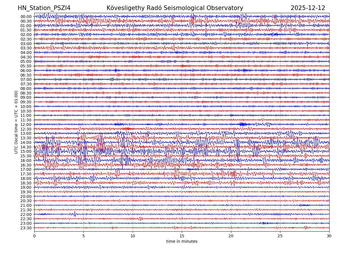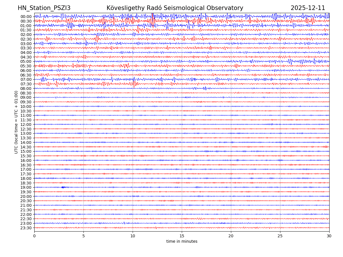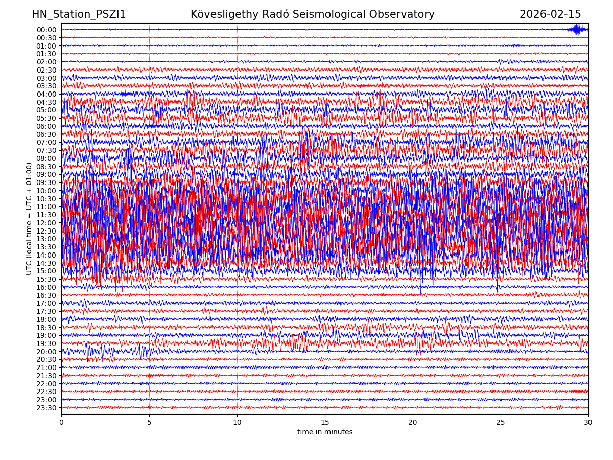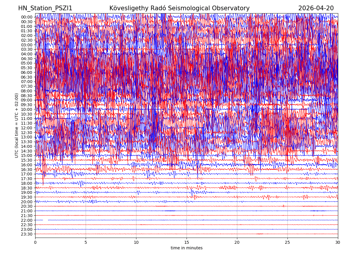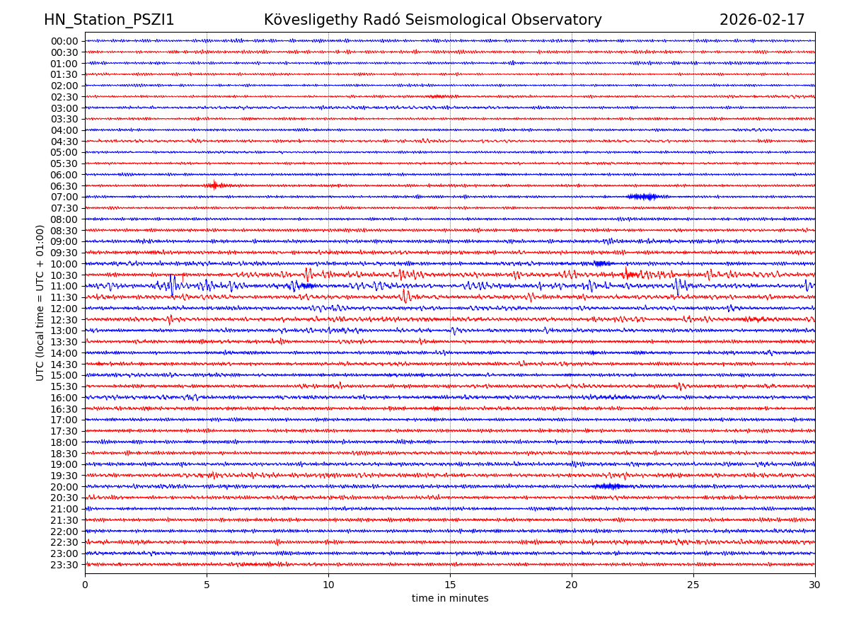 A kiválasztott képre kattintva megtekintheti a kérdéses magyarországi infrahang állomás által detektált élő regisztrátumot. Az előző tíz nap során rögzített infrahang regisztrátumok a képek alatt található linkeket követve jeleníthetők meg. (Az időskála világidőben [UTC] értendő, melyhez képest Magyarországon a helyi idő a téli időszámítás idején +1, nyári időszámítás esetén +2 óra.)