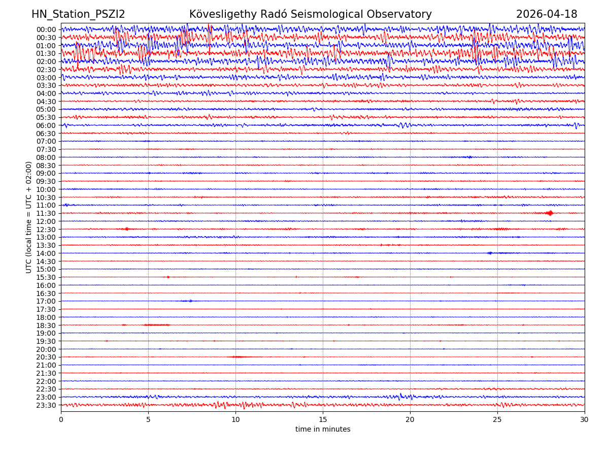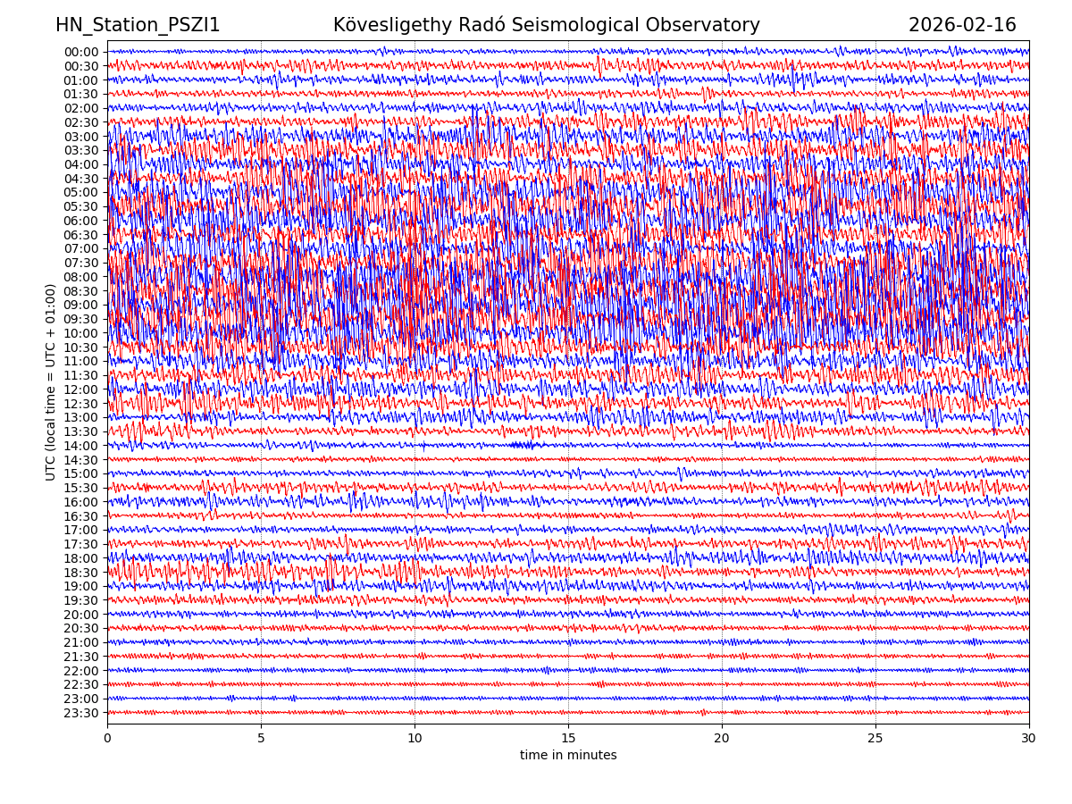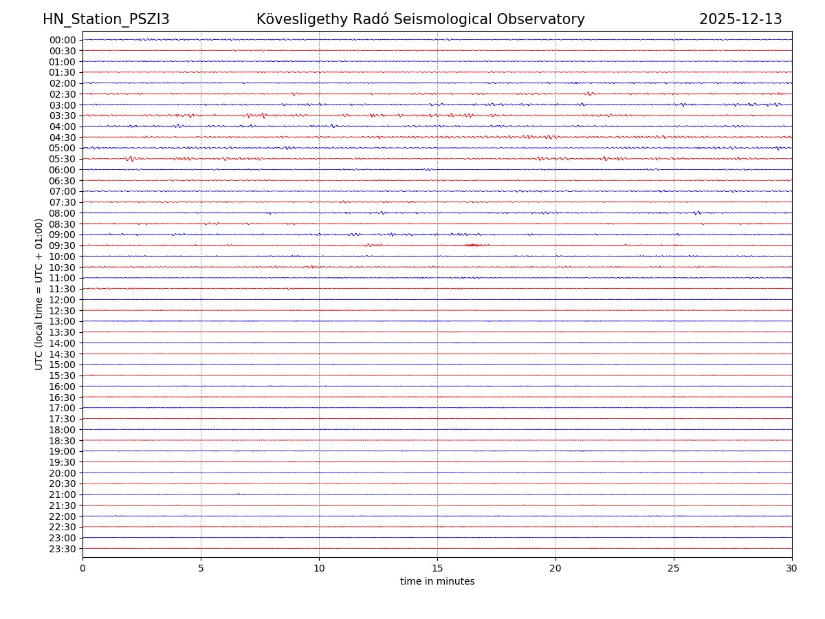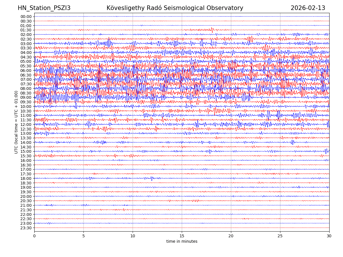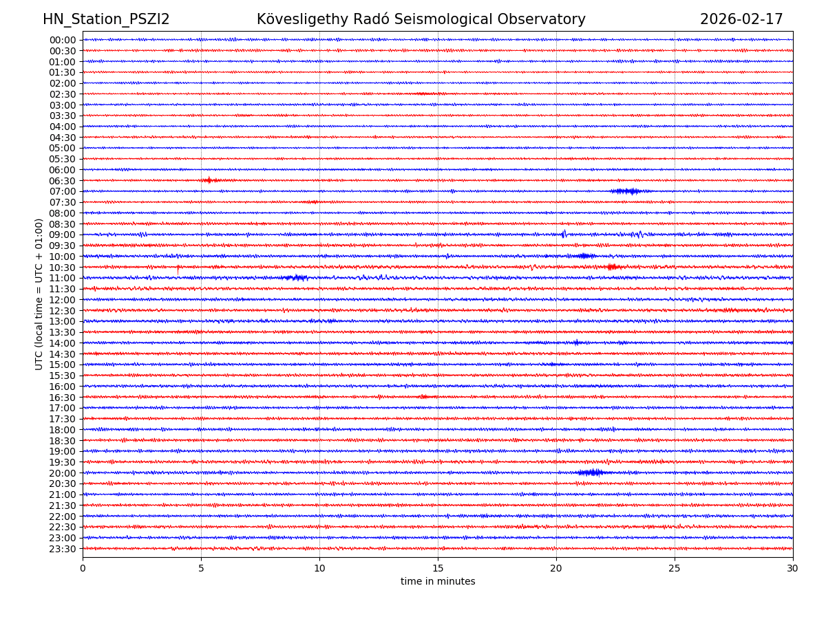 A kiválasztott képre kattintva megtekintheti a kérdéses magyarországi infrahang állomás által detektált élő regisztrátumot. Az előző tíz nap során rögzített infrahang regisztrátumok a képek alatt található linkeket követve jeleníthetők meg. (Az időskála világidőben [UTC] értendő, melyhez képest Magyarországon a helyi idő a téli időszámítás idején +1, nyári időszámítás esetén +2 óra.)