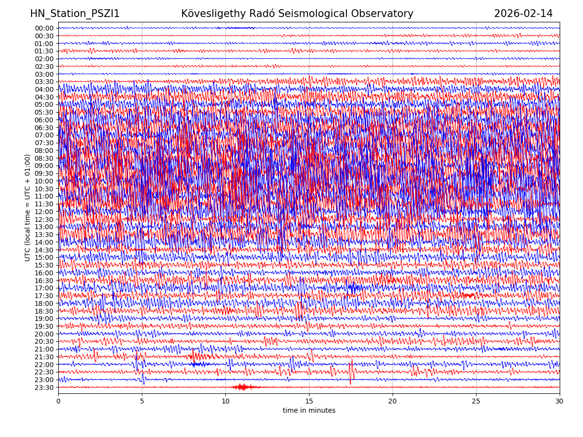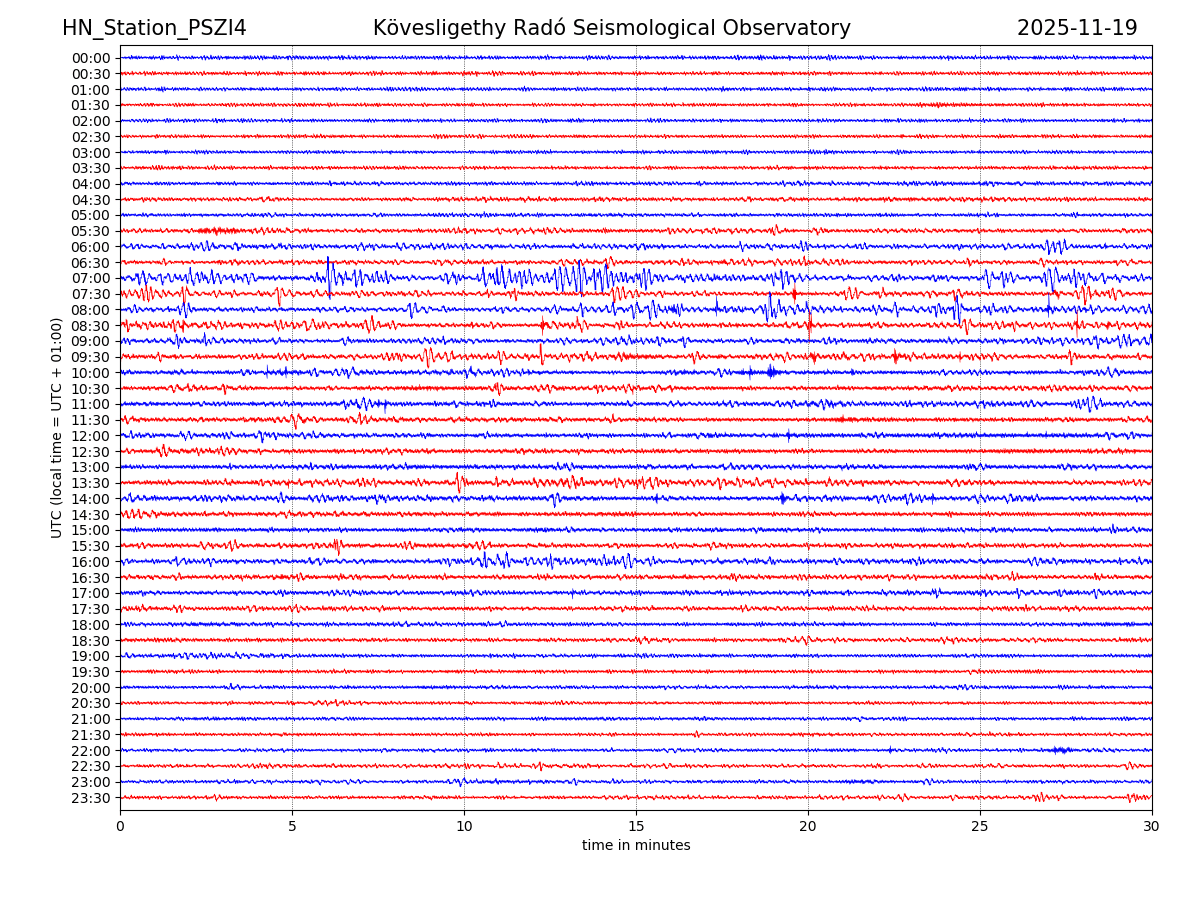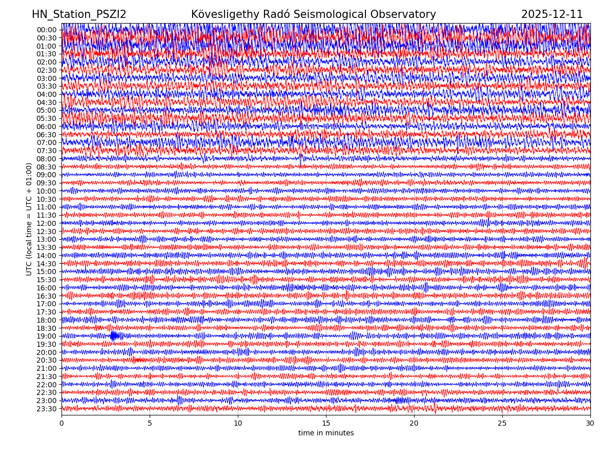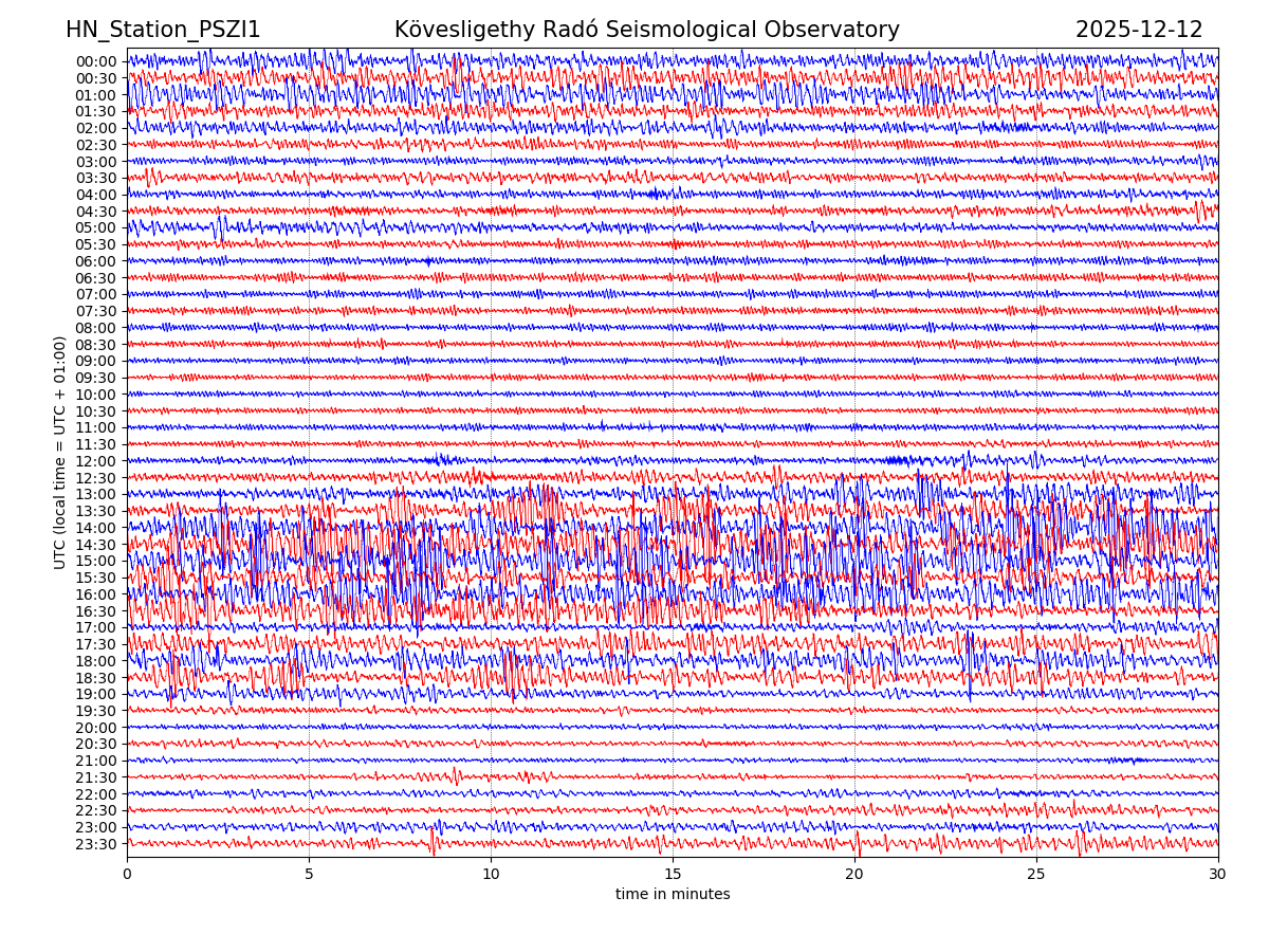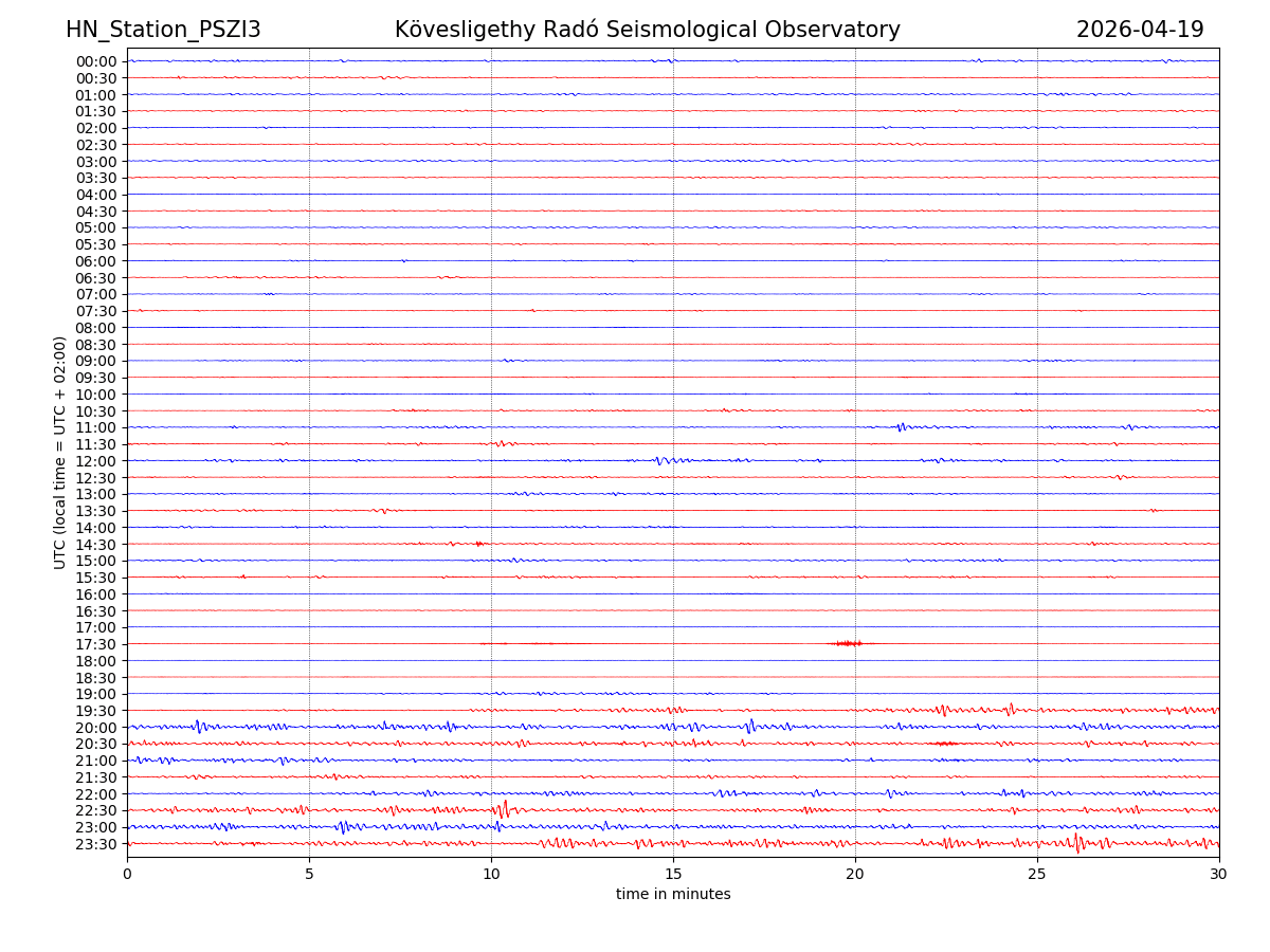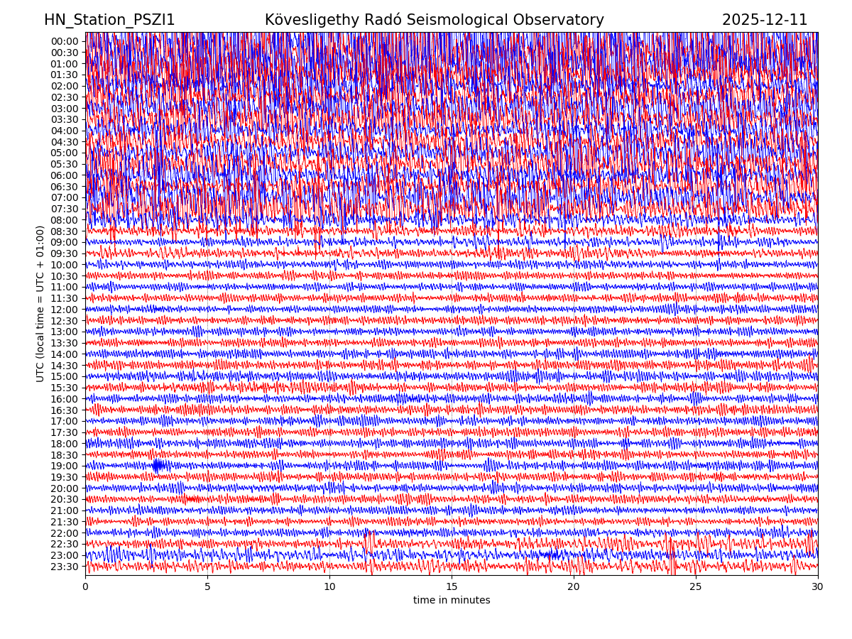 A kiválasztott képre kattintva megtekintheti a kérdéses magyarországi infrahang állomás által detektált élő regisztrátumot. Az előző tíz nap során rögzített infrahang regisztrátumok a képek alatt található linkeket követve jeleníthetők meg. (Az időskála világidőben [UTC] értendő, melyhez képest Magyarországon a helyi idő a téli időszámítás idején +1, nyári időszámítás esetén +2 óra.)