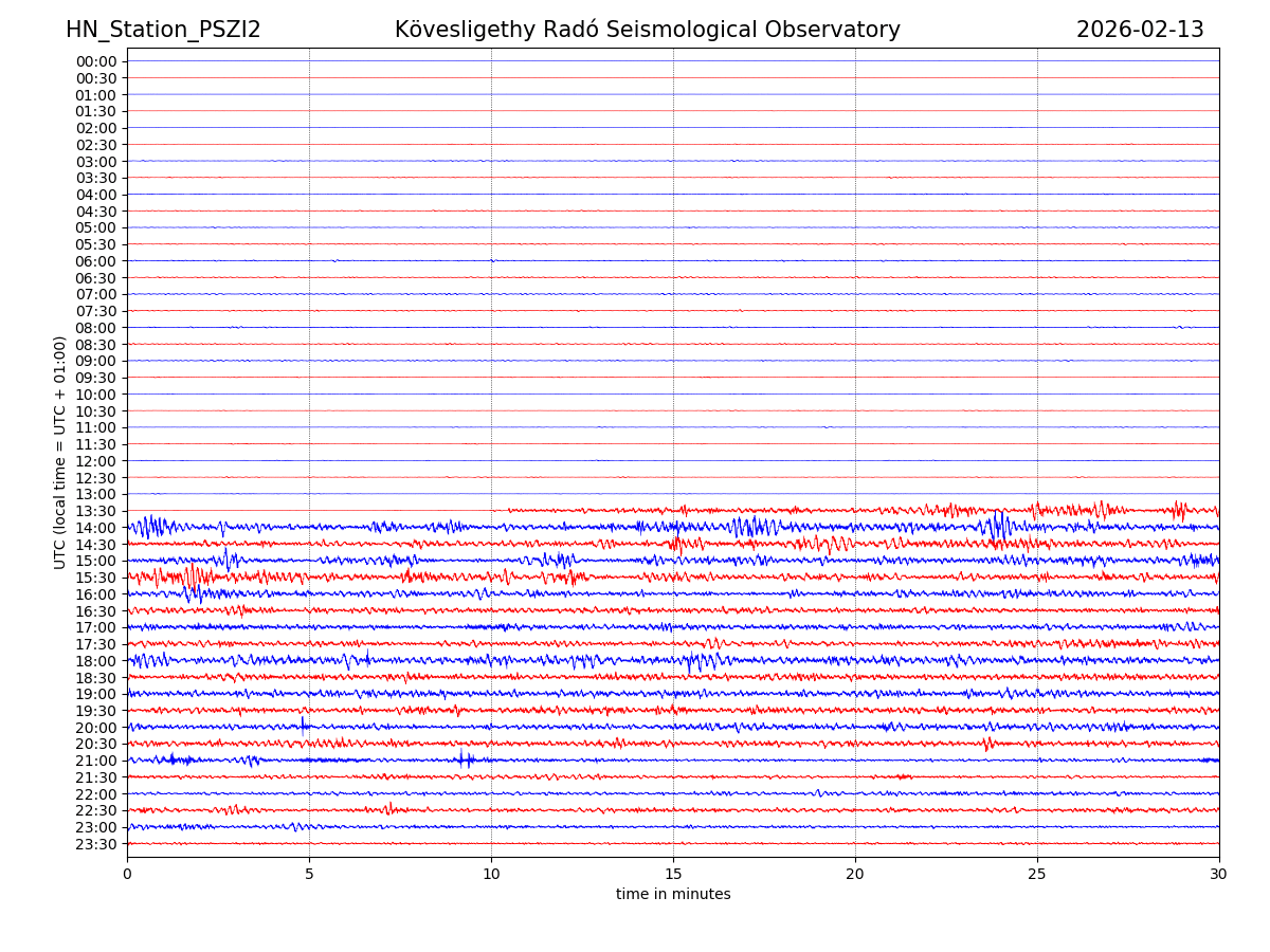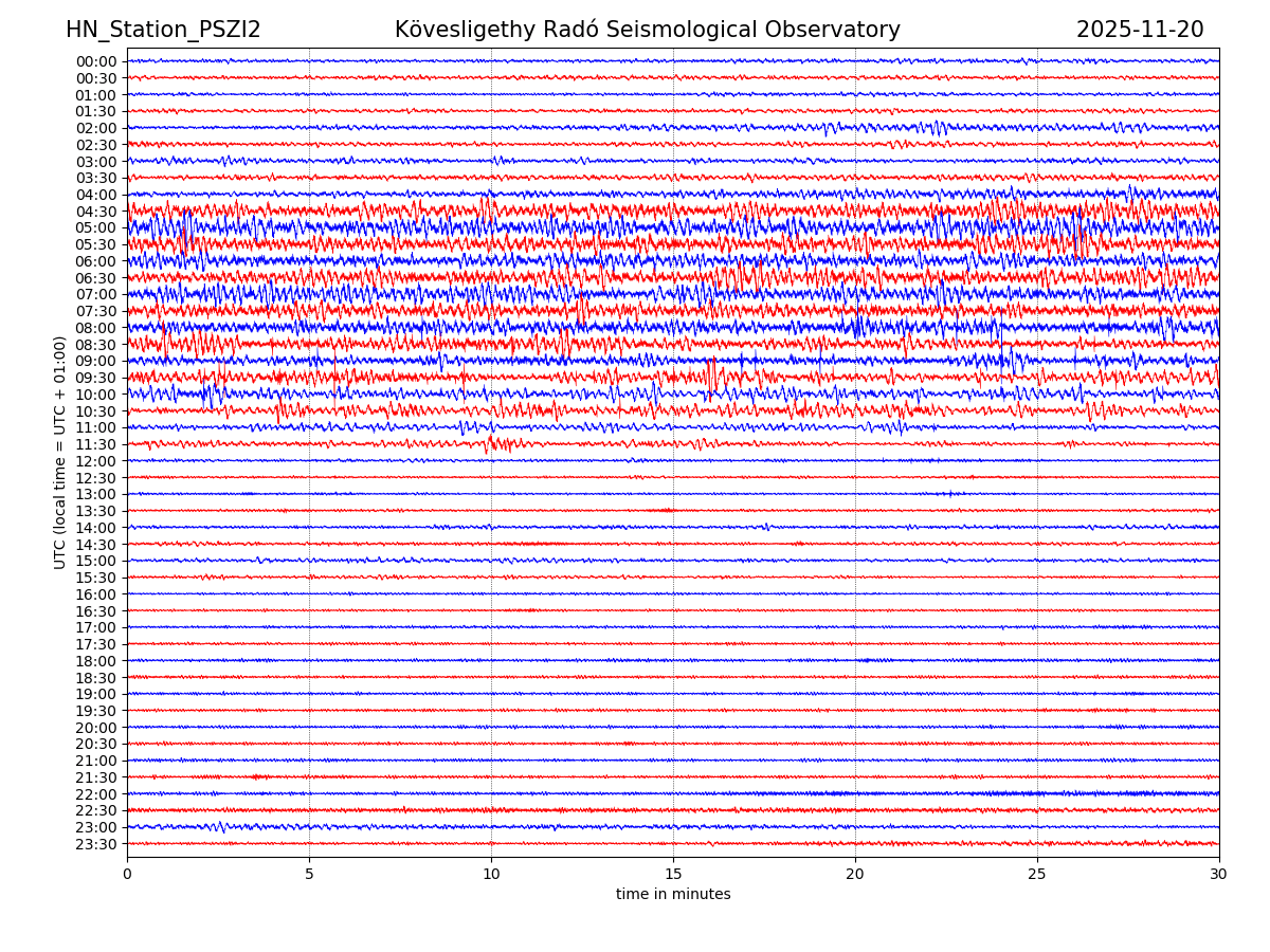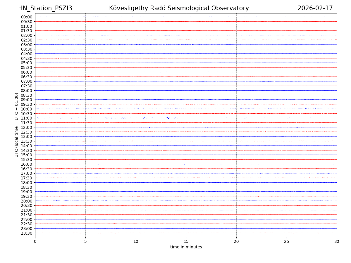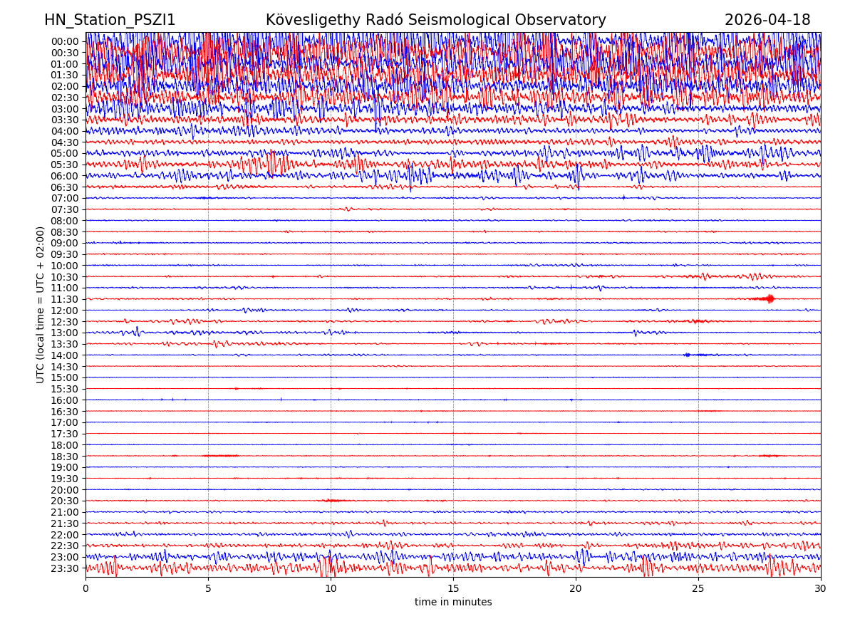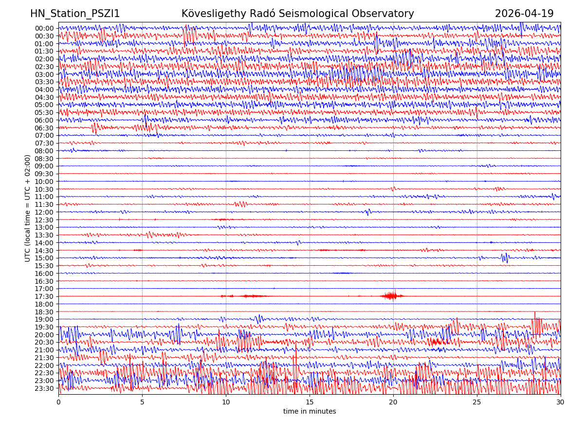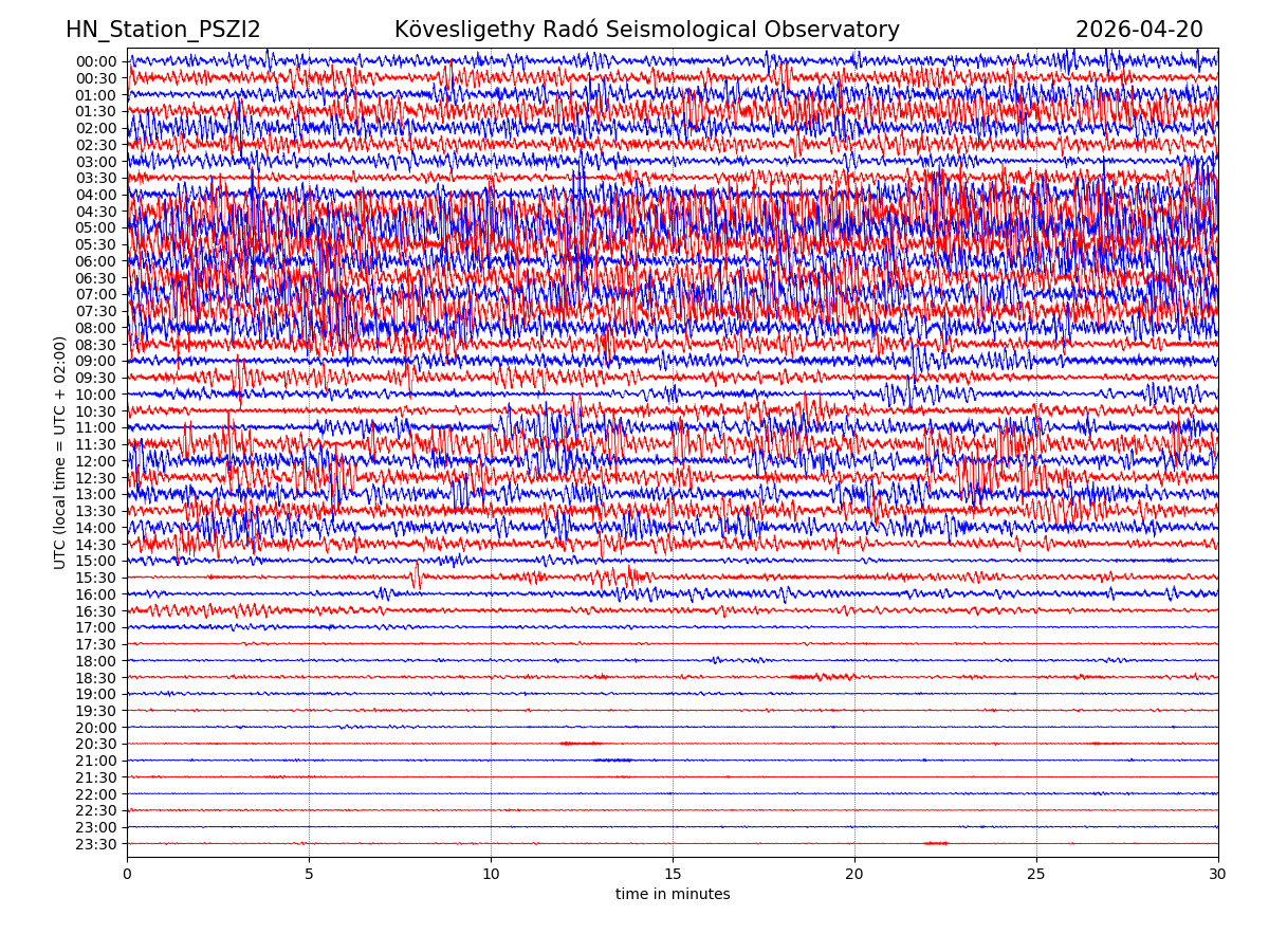 A kiválasztott képre kattintva megtekintheti a kérdéses magyarországi infrahang állomás által detektált élő regisztrátumot. Az előző tíz nap során rögzített infrahang regisztrátumok a képek alatt található linkeket követve jeleníthetők meg. (Az időskála világidőben [UTC] értendő, melyhez képest Magyarországon a helyi idő a téli időszámítás idején +1, nyári időszámítás esetén +2 óra.)
