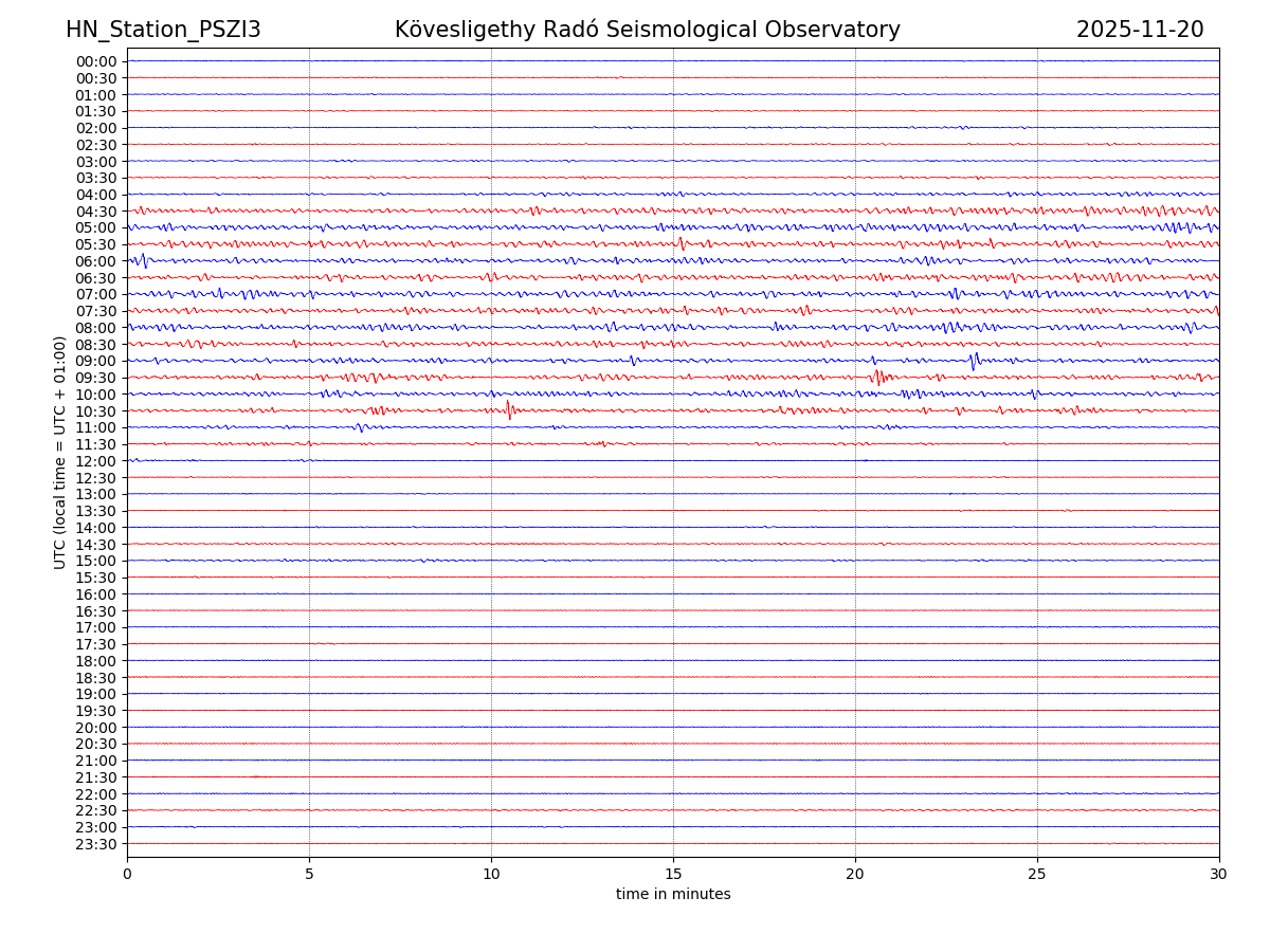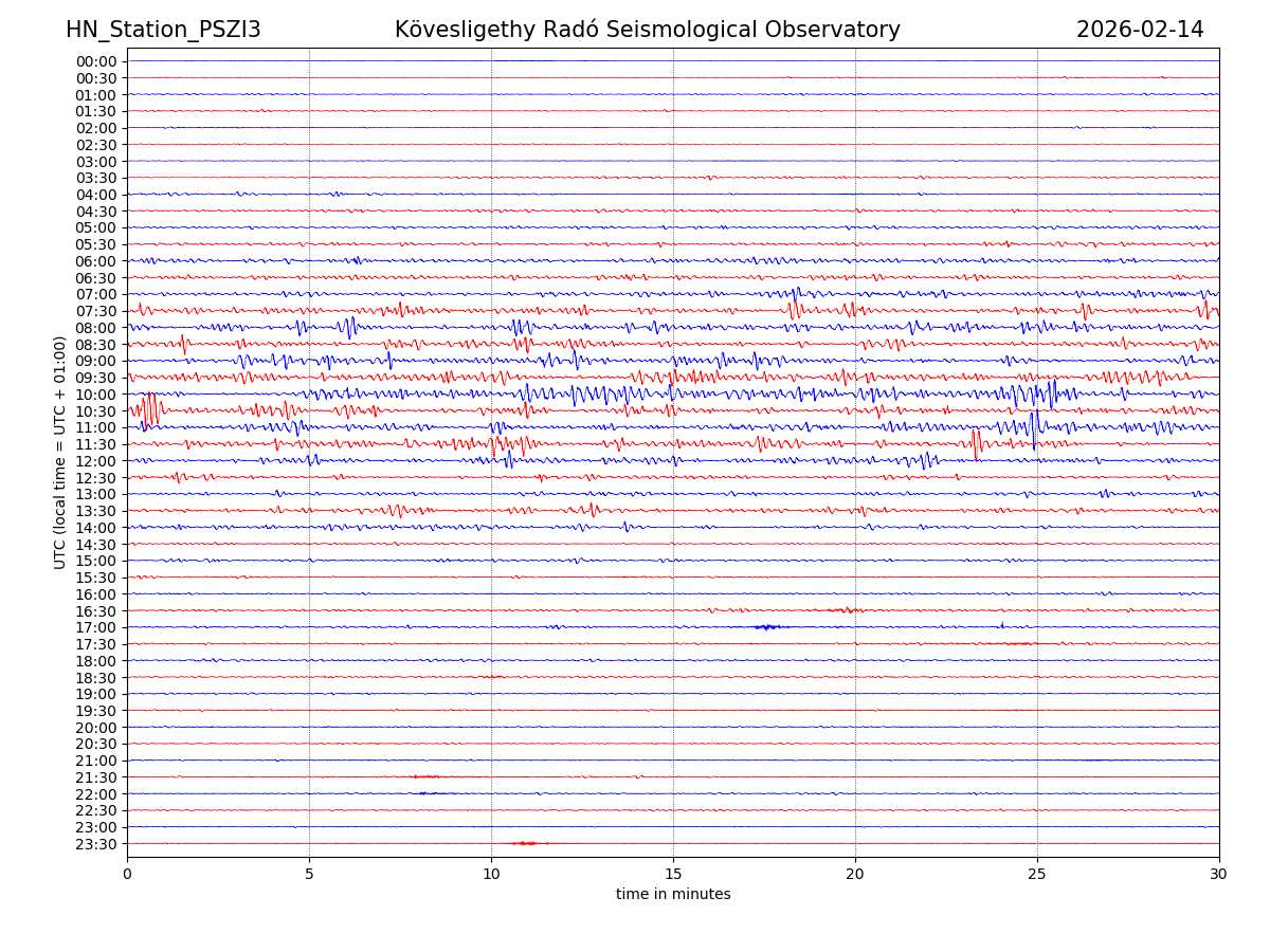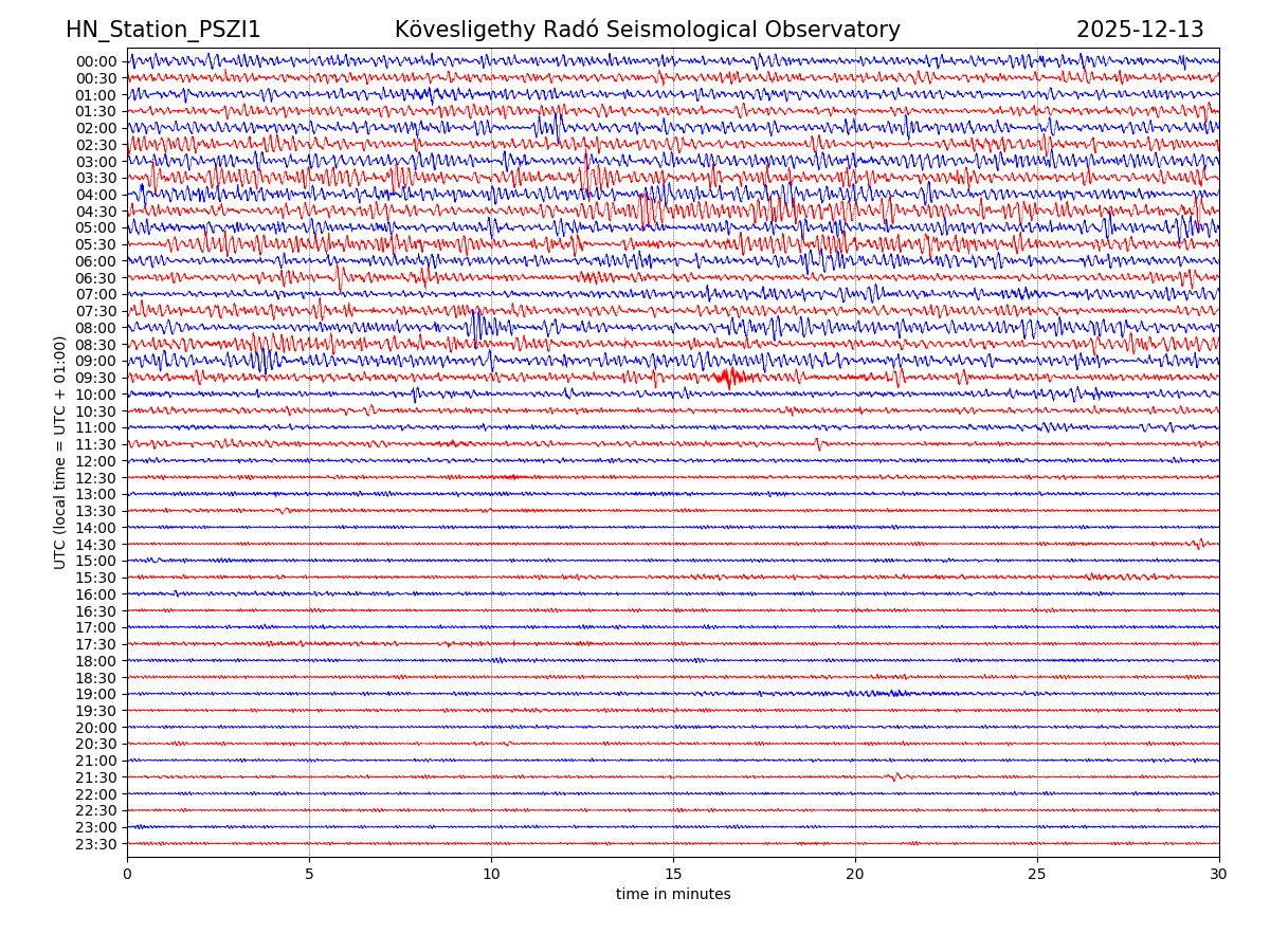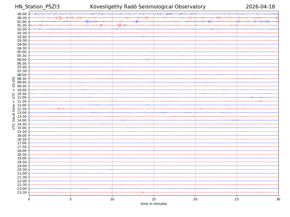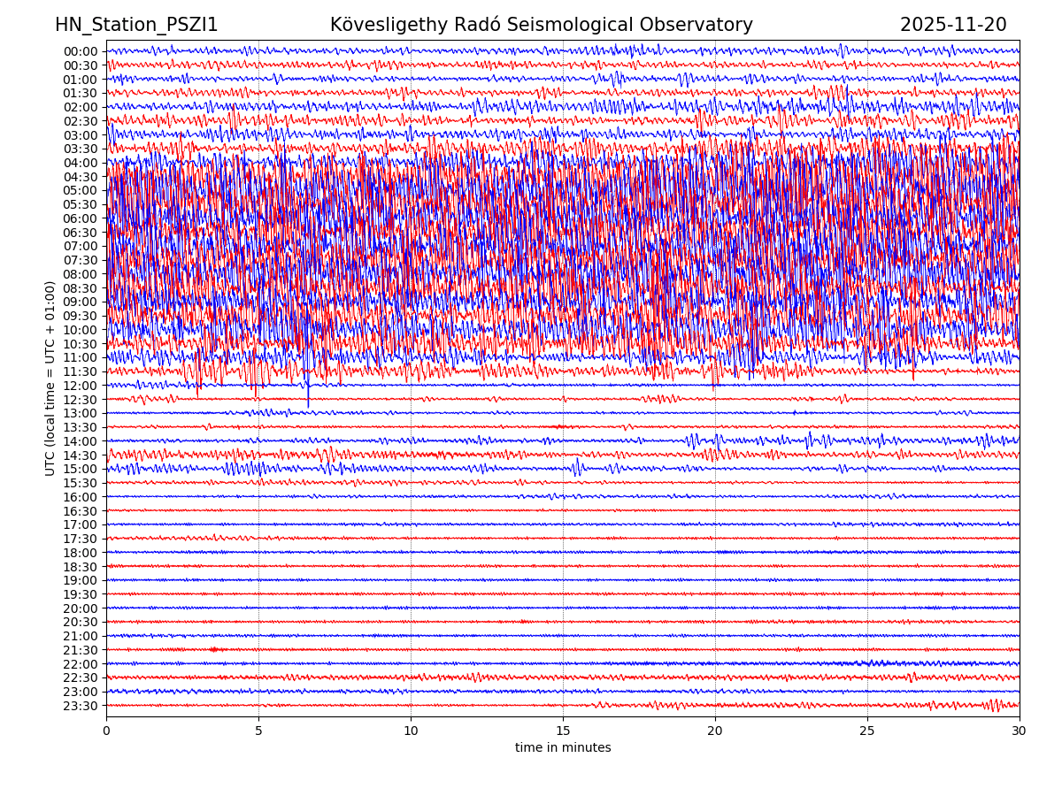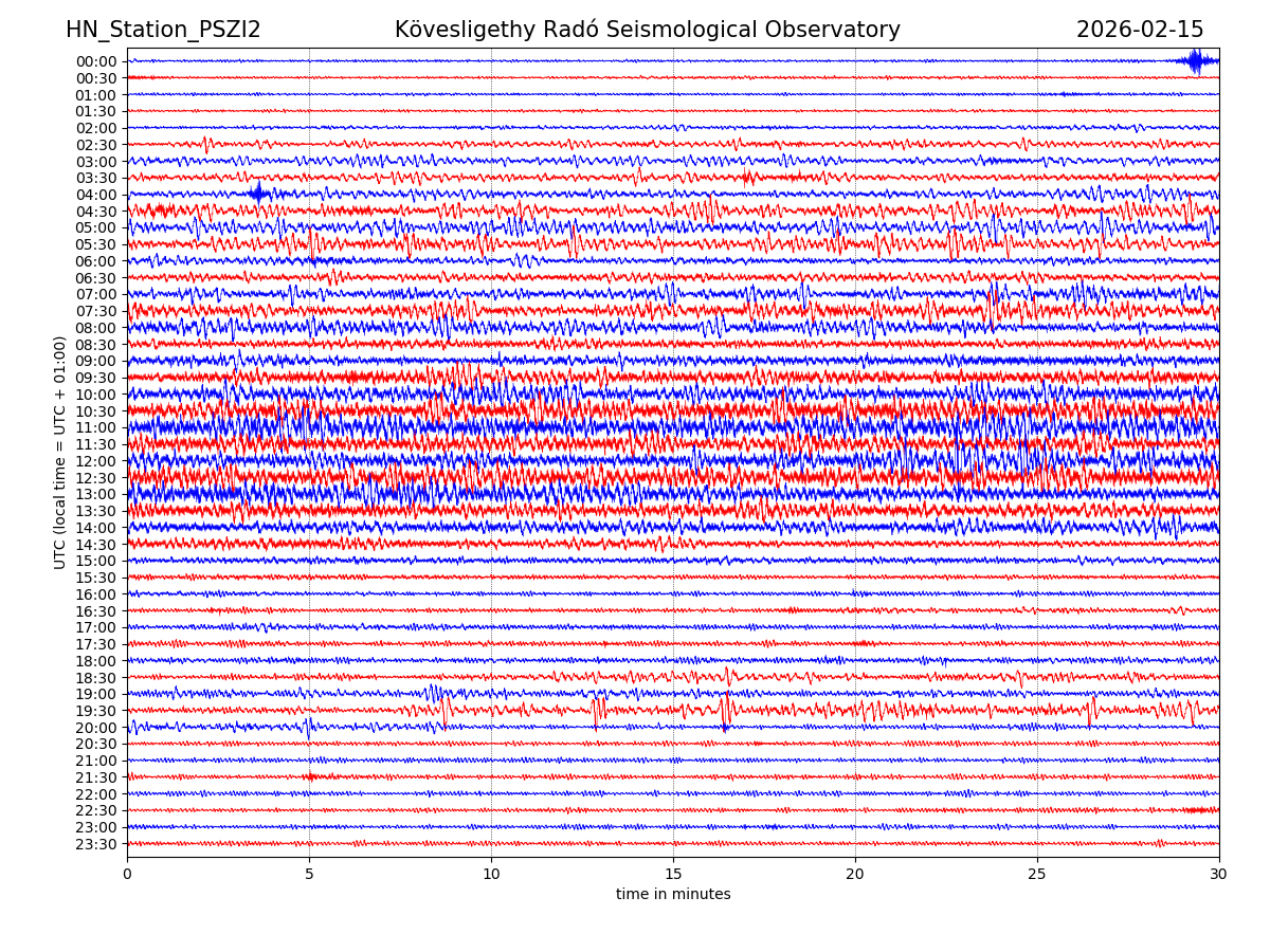 A kiválasztott képre kattintva megtekintheti a kérdéses magyarországi infrahang állomás által detektált élő regisztrátumot. Az előző tíz nap során rögzített infrahang regisztrátumok a képek alatt található linkeket követve jeleníthetők meg. (Az időskála világidőben [UTC] értendő, melyhez képest Magyarországon a helyi idő a téli időszámítás idején +1, nyári időszámítás esetén +2 óra.)