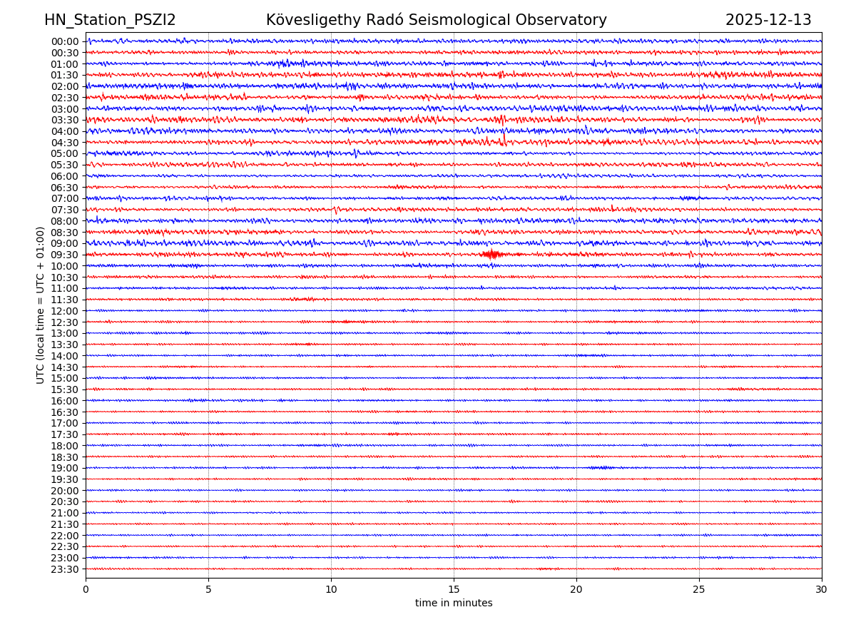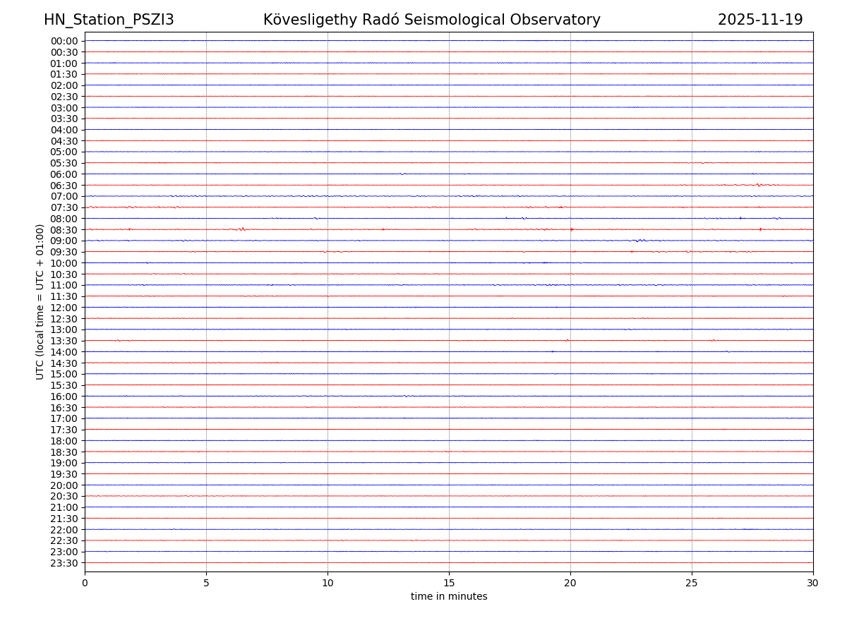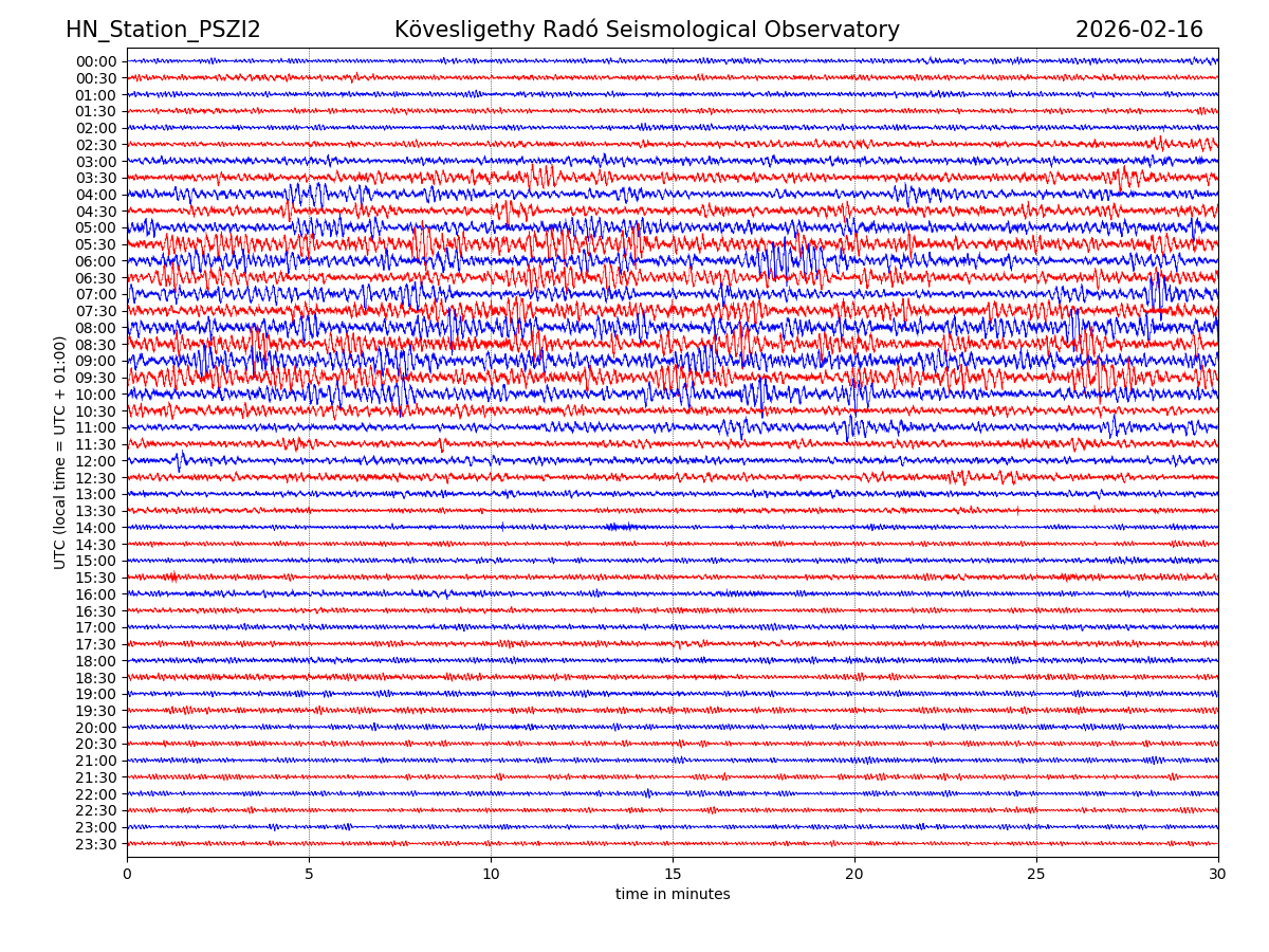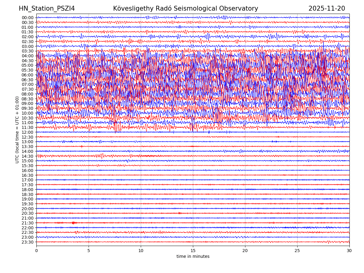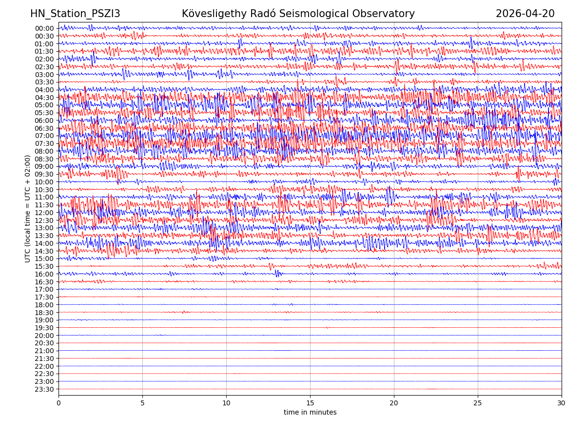 A kiválasztott képre kattintva megtekintheti a kérdéses magyarországi infrahang állomás által detektált élő regisztrátumot. Az előző tíz nap során rögzített infrahang regisztrátumok a képek alatt található linkeket követve jeleníthetők meg. (Az időskála világidőben [UTC] értendő, melyhez képest Magyarországon a helyi idő a téli időszámítás idején +1, nyári időszámítás esetén +2 óra.)
