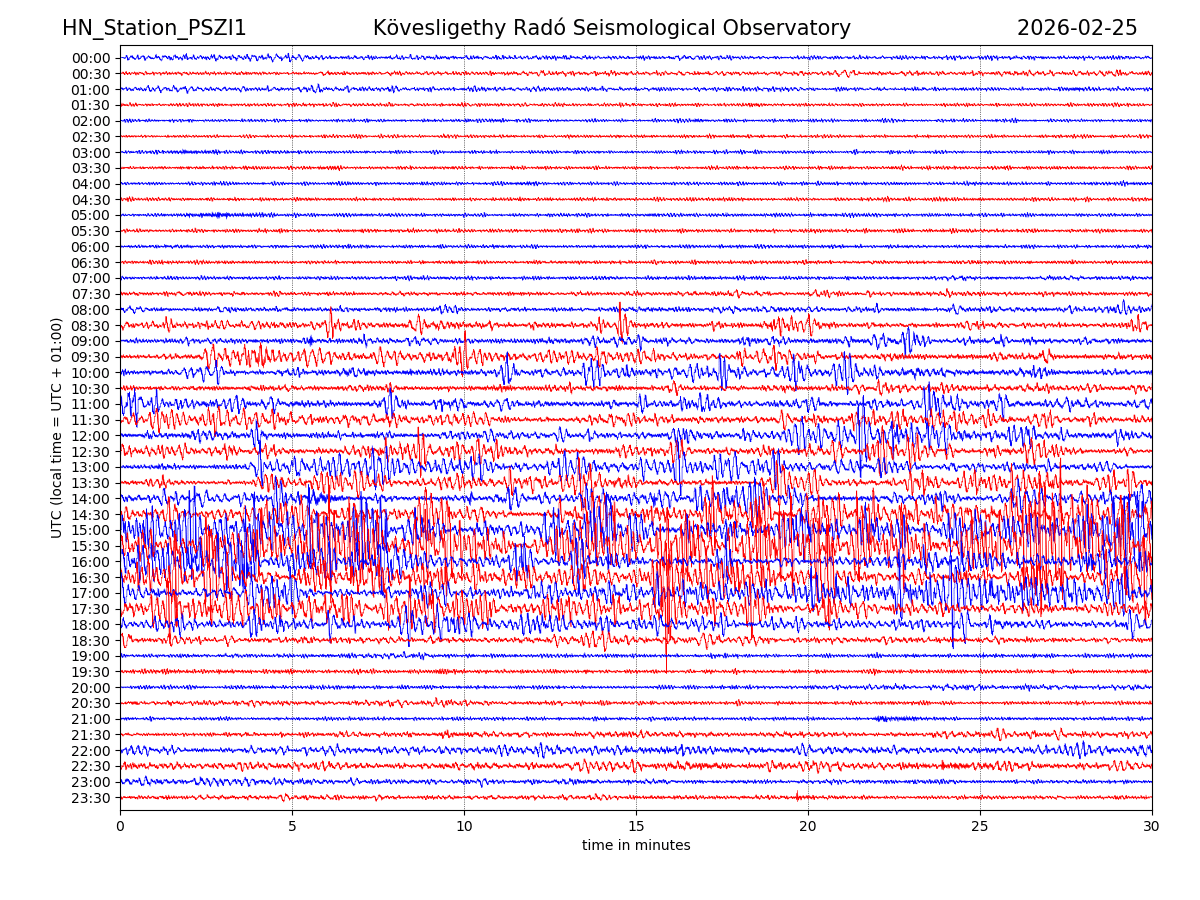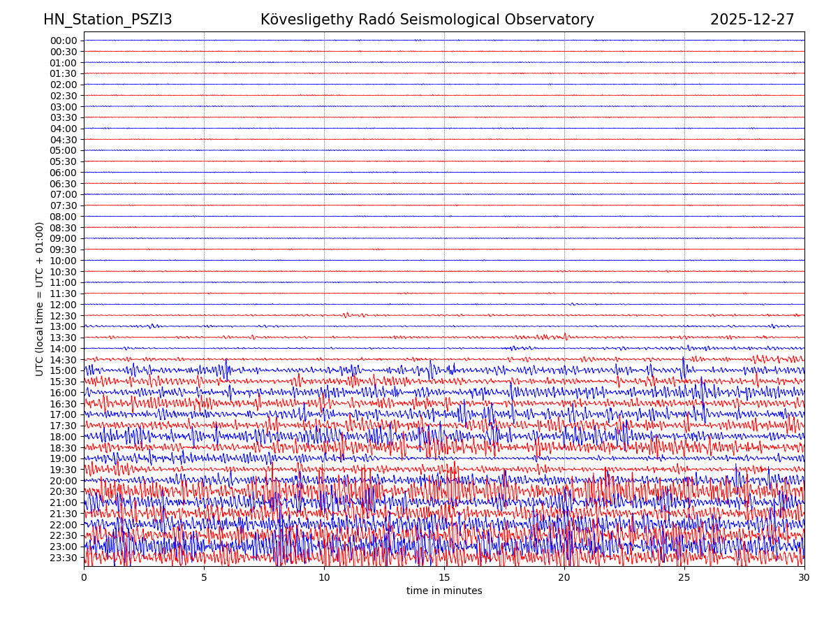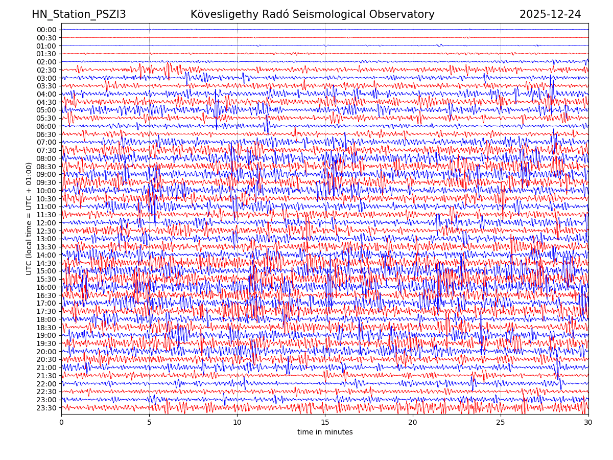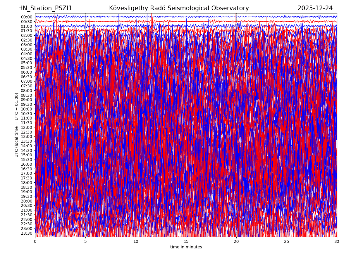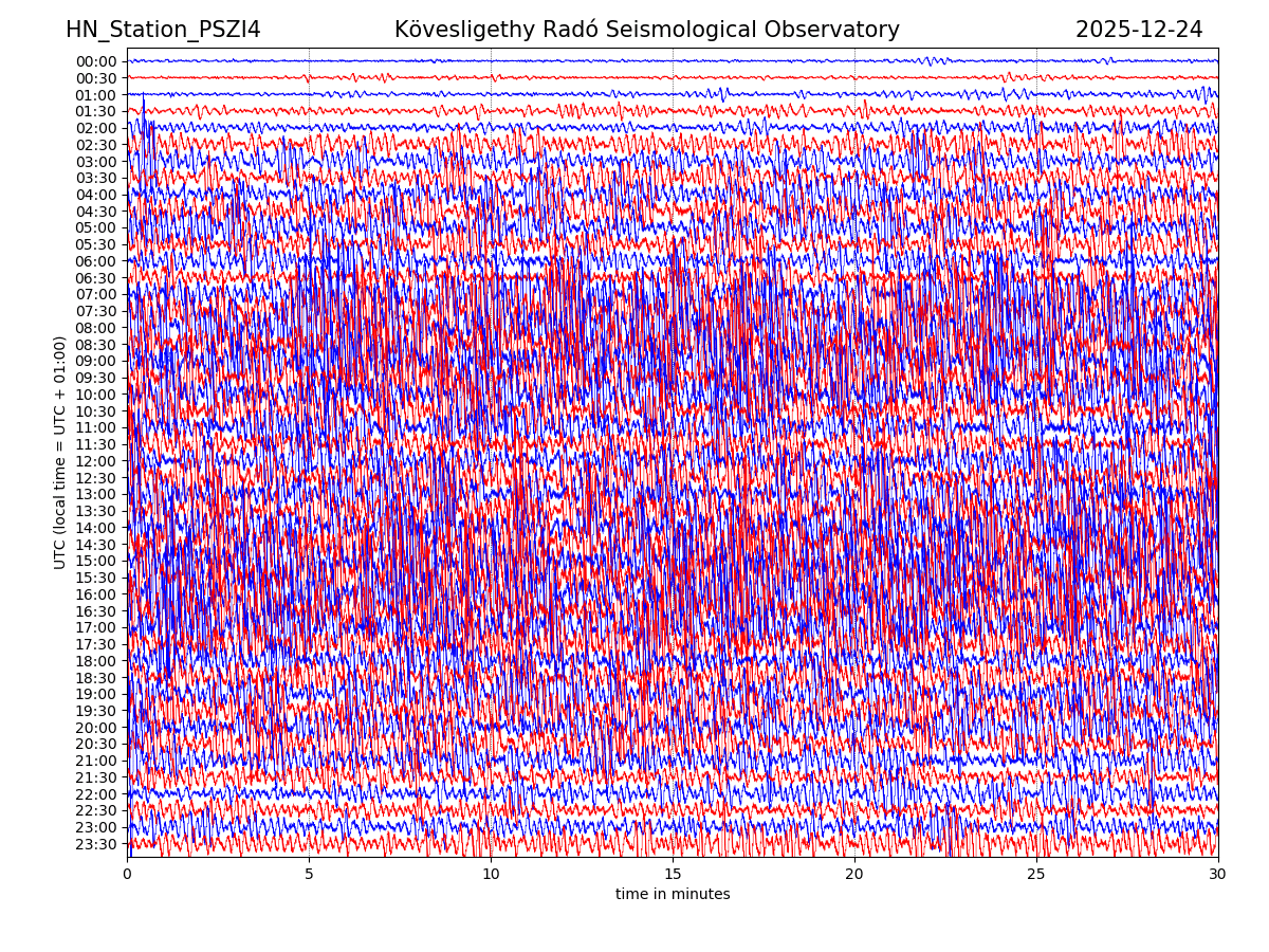A kiválasztott képre kattintva megtekintheti a kérdéses magyarországi infrahang állomás által detektált élő regisztrátumot. Az előző tíz nap során rögzített infrahang regisztrátumok a képek alatt található linkeket követve jeleníthetők meg. (Az időskála világidőben [UTC] értendő, melyhez képest Magyarországon a helyi idő a téli időszámítás idején +1, nyári időszámítás esetén +2 óra.)