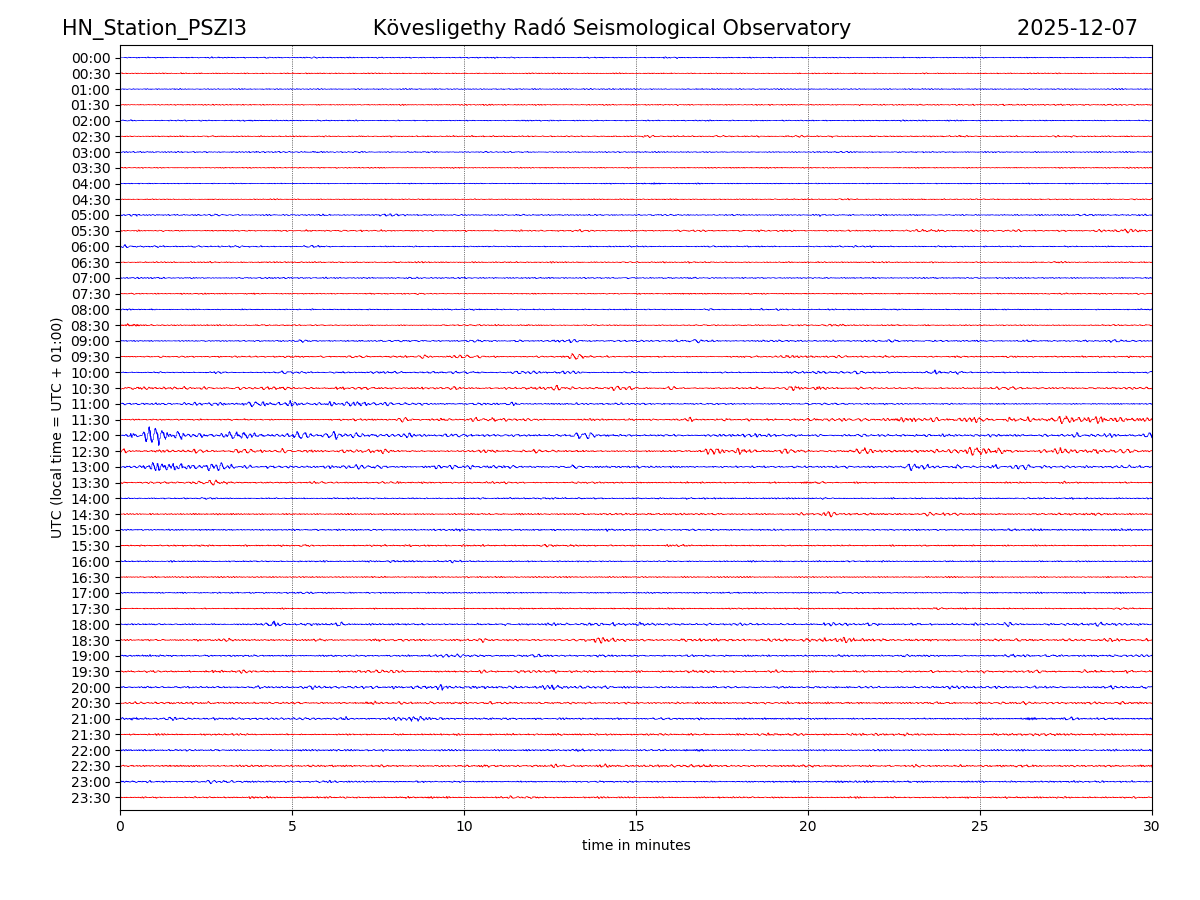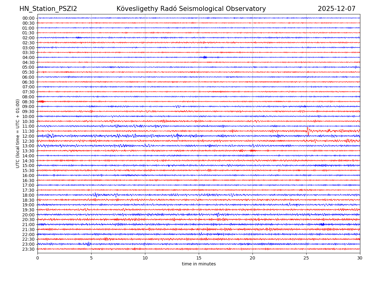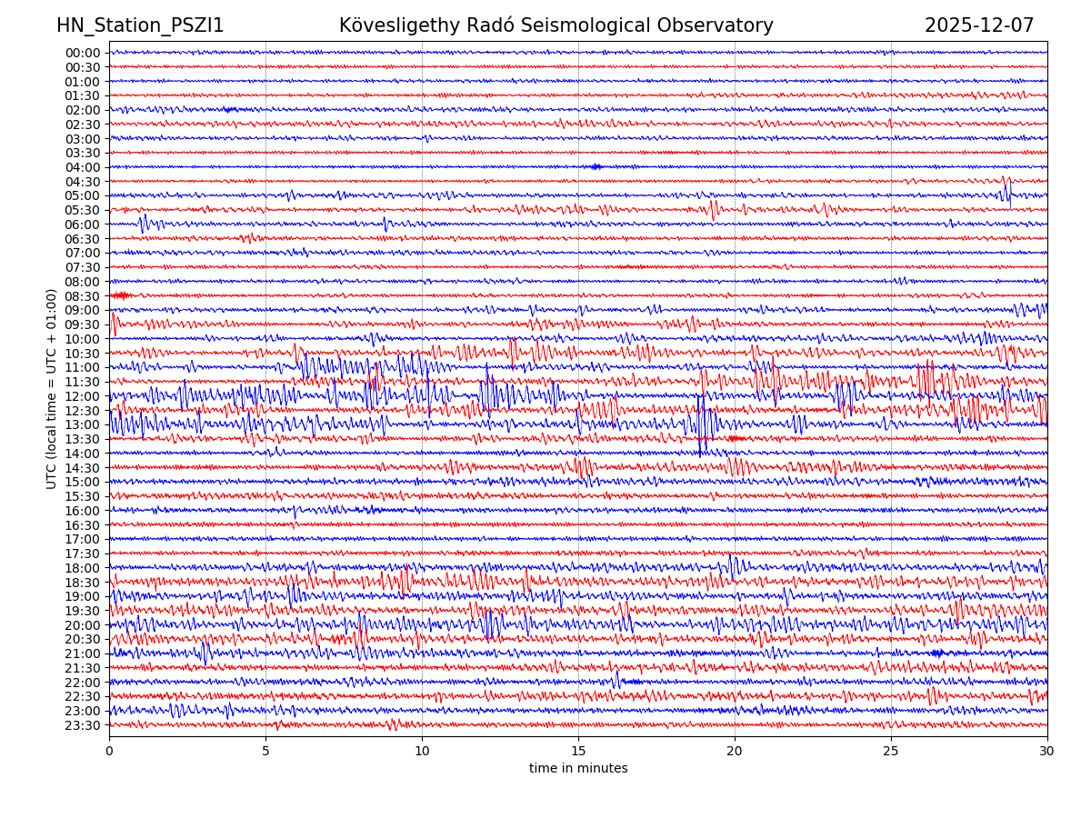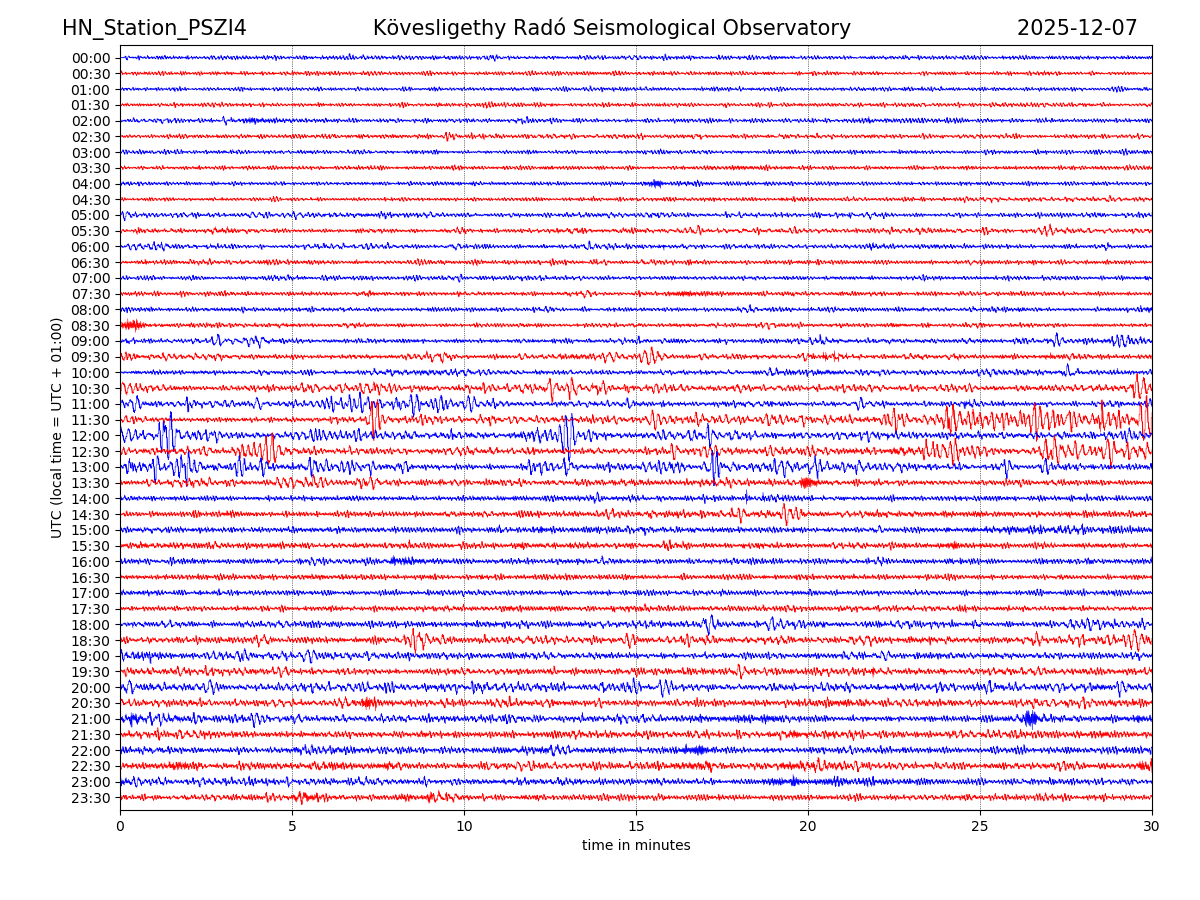A kiválasztott képre kattintva megtekintheti a kérdéses magyarországi infrahang állomás által detektált élő regisztrátumot. Az előző tíz nap során rögzített infrahang regisztrátumok a képek alatt található linkeket követve jeleníthetők meg. (Az időskála világidőben [UTC] értendő, melyhez képest Magyarországon a helyi idő a téli időszámítás idején +1, nyári időszámítás esetén +2 óra.)