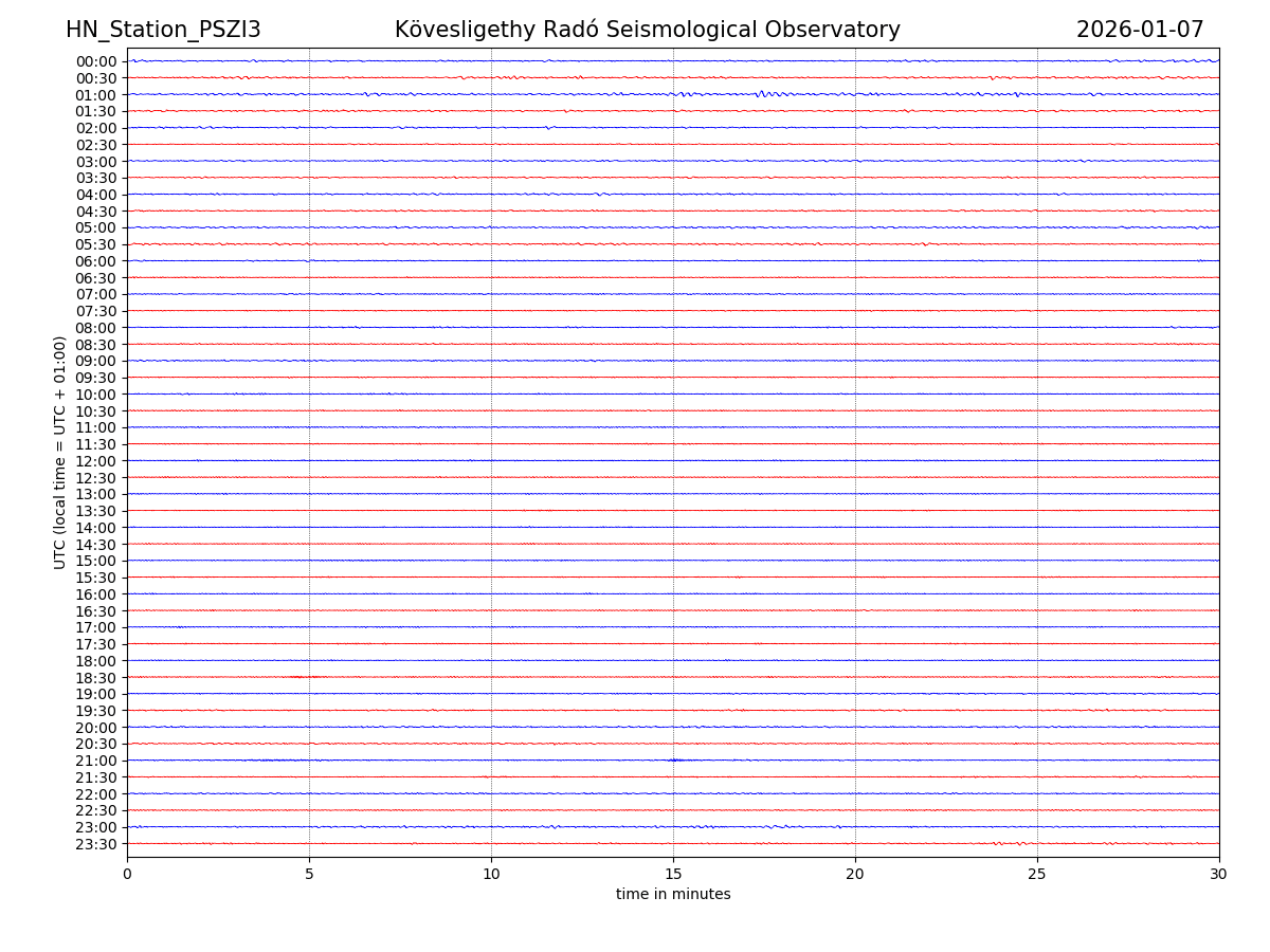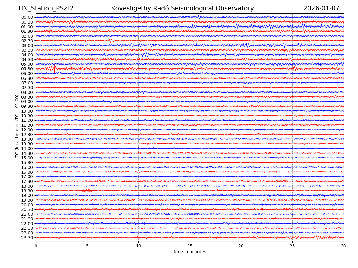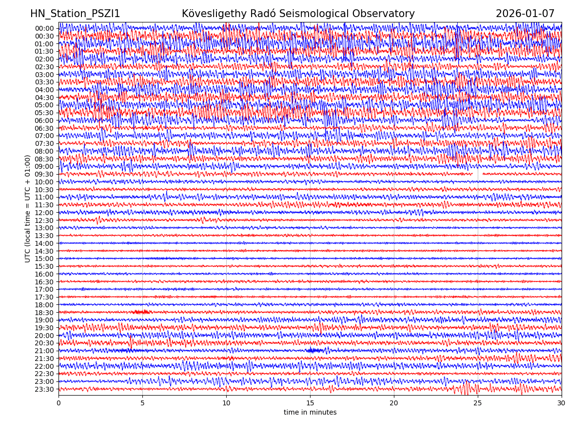 A kiválasztott képre kattintva megtekintheti a kérdéses magyarországi infrahang állomás által detektált élő regisztrátumot. Az előző tíz nap során rögzített infrahang regisztrátumok a képek alatt található linkeket követve jeleníthetők meg. (Az időskála világidőben [UTC] értendő, melyhez képest Magyarországon a helyi idő a téli időszámítás idején +1, nyári időszámítás esetén +2 óra.)